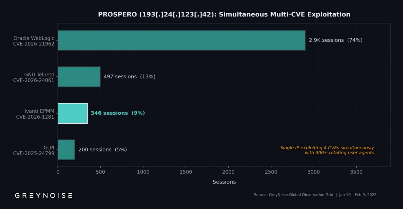 Этот IP-адрес не ограничивается атаками на Ivanti, поскольку он одновременно эксплуатировал еще три уязвимости: CVE-2026-21962 в Oracle WebLogic, CVE-2026-24061 в GNU Inetutils Telnetd и CVE-2025-24799 в GLPI.